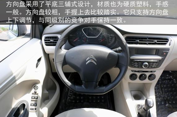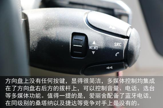 方向盘上没有任何按键,显得很简洁,多媒体控制均集成在了方向盘右后方的拨杆上,可以控制音量、电话、选台等多媒体功能。因为从来没有用过这种的多媒体控制杆,我们在试车时使用起来稍不习惯,但容易上手,不会影响操作便捷性。值得一提的是,全新爱丽舍配备了蓝牙电话,在同级别的桑塔纳以及捷达等竞争对手上是没有的。