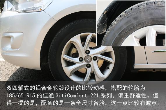 双四辅式的铝合金轮毂设计的比较动感,搭配的轮胎为185/65 R15的佳通GitiComfort 221系列,偏重舒适性。值得一提的是,配备的是一条全尺寸备胎,这一点比较有诚意。