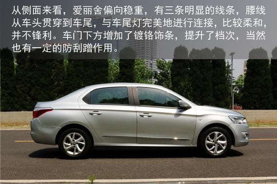 从侧面来看,全新爱丽舍偏向稳重,有三条明显的线条,腰线从车头贯穿到车尾,与车尾灯完美地进行连接,比较柔和,并不锋利。车门下方增加了镀铬饰条,提升了档次,当然也有一定的防刮蹭作用。