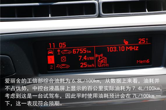 全新爱丽舍的工信部综合油耗为6.8L/100km,从数据上来看,油耗并不占优势,中控台液晶屏上显示的百公里实际油耗为7.4L/100km,考虑到这是一台试驾车,因此平时使用油耗预计会在7L/100km一下,这一表现符合预期。
