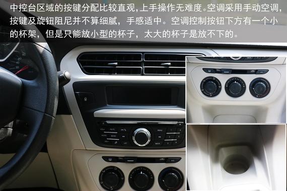 中控台区域的按键分配比较直观,上手操作无难度。空调采用手动空调,按键及旋钮阻尼并不算细腻,手感适中。空调控制按钮下方有一个小的杯架,但是只能放小型的杯子,太大的杯子是放不下的。